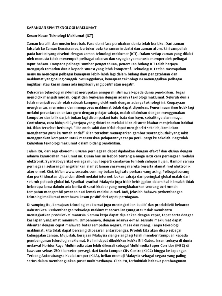 Oleh itu masyarakat malaysia perlu memanfaatkan teknologi maklumat sebaik-baik mungkin. Contoh karangan spm bahasa melayu tingkatan 4 5. Dalam era ledakan maklumat initeknologi dan komunikasi atau TMK amat pentingTeknologi ini sudah menguasai global dengan berleluasaHampir setiap saat orang menggunakan teknologi ini dan dengan teknologi jugalah menyebabkan kita boleh menguasai dan mengawal hampir setiap perkara dihujung jari sahajaNegara yang tidak mengutamakan.